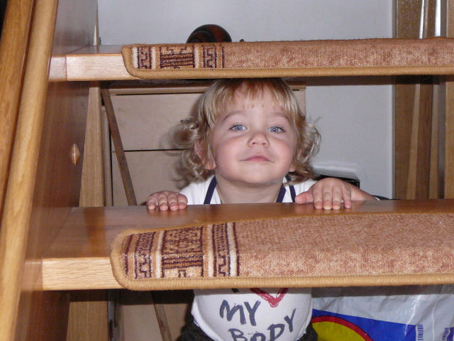 Tady mne vidíte na mém oblíbeném místě - pod schody. Těžko vám to budu vysvětlovat, ale ňamňům se hraní pod schody prostě líbí.