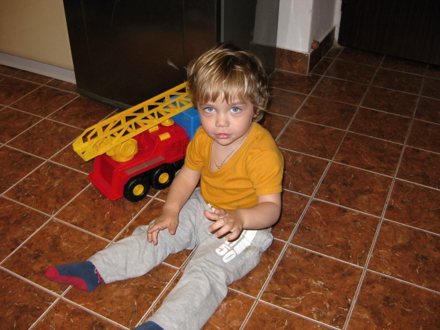 Při druhé oslavě svých druhých narozenin jsem dostal od tety Ivy a strejdy Pavla velké hasičské auto se žebříkem. Rukama vám ukazuji, kolik že je mi roků. Takže teď už vím, že jsem "Matýšek Koa" a je mi "da oky".